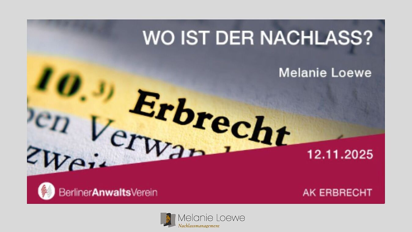 12. November 2025 „Wo ist der Nachlass?“ - Melanie Loewe referiert beim Berliner Anwaltsverein zur Spurensuche in der Nachlassabwicklung Im Arbeitskreis Erbrecht des Berliner Anwaltsvereins hält die Nachlass-Expertin Melanie Loewe am 12. November 2025 einen… weiterlesen