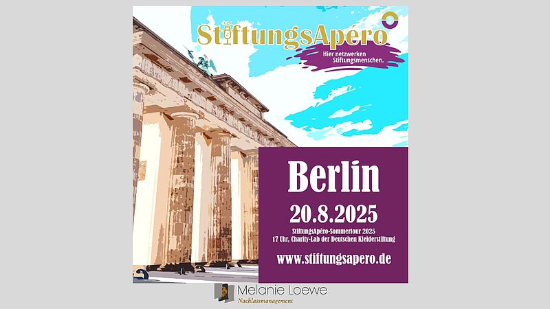 Beim Berliner StiftungsApéro im Rahmen der Sommertour 2025 war die Nachlass-Expertin Melanie Loewe als Gesprächspartnerin zu Gast. Die Veranstaltung, ausgerichtet vom Stiftungsmarktplatz.eu in Kooperation mit der Deutschen Kleiderstiftung, brachte Vertreterinnen und Vertreter aus Stiftungen, Beratung und Zivilgesellschaft zum fachlichen Austausch zusammen.